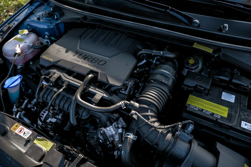 Pod kapotou sme mali motor 1.0 T-GDi s maximálnym výkonom 73,5 kW/100 koní, ktorý v prípade, že máte k dispozícii sedemstupňový dvojspojkový automat poskytuje maximálny krútiaci moment na úrovni rovných 200 Nm. Nechýba mikrohybrodná technológia. Dynamika je priemerná, z 0 na 100 km/h zrýchli Bayon za 12,4 sekundy a maximálna rýchlosť sa pohybuje na úrovni 176 km/h. Opäť je to priemer v triede, športovú dynamiku tu nehľadá takmer nikto. A v reálnej premávke sa táto verzia prejavuje dostatočne potentná na to, aby ste s ňou dokázali jazdiť podľa vlastných predstáv. Práve vaša pravá noha určí priemernú spotrebu, dokážete sa pohybovať od piatich litrov na 100 kilometrov až po 6,9 litrovú hranicu ak sa radi na cestách zabávate. Väčšina majiteľov však bude kulminovať na hranici šiestich litrov, čo je vynikajúca hodnota.